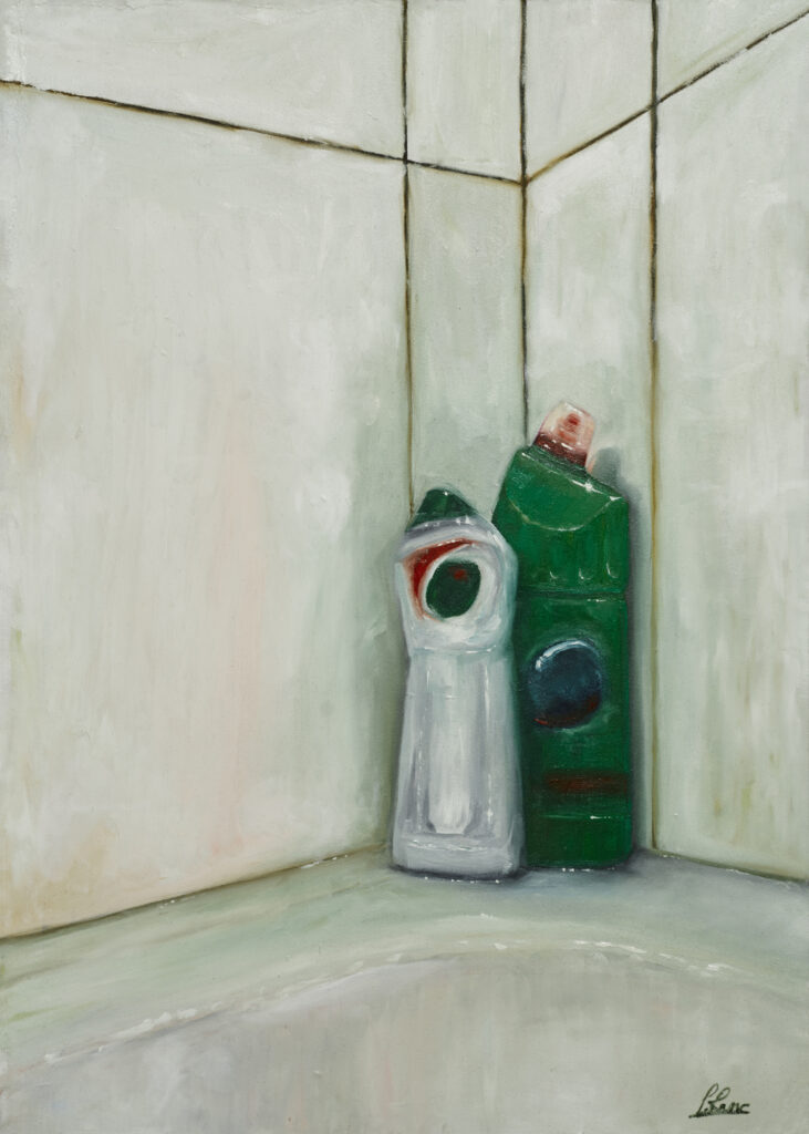 The painting 'my home’ depicts, the simplest sens the problem with over-consumerism. Nowadays we are surrounded by advertising and marketing more than ever before. Despite the absence of logos on bottles, we are able to recall exactly the font used and its colour. Even if the logo does not appear in the image, the learned and acquired image in our heads suggests the name.